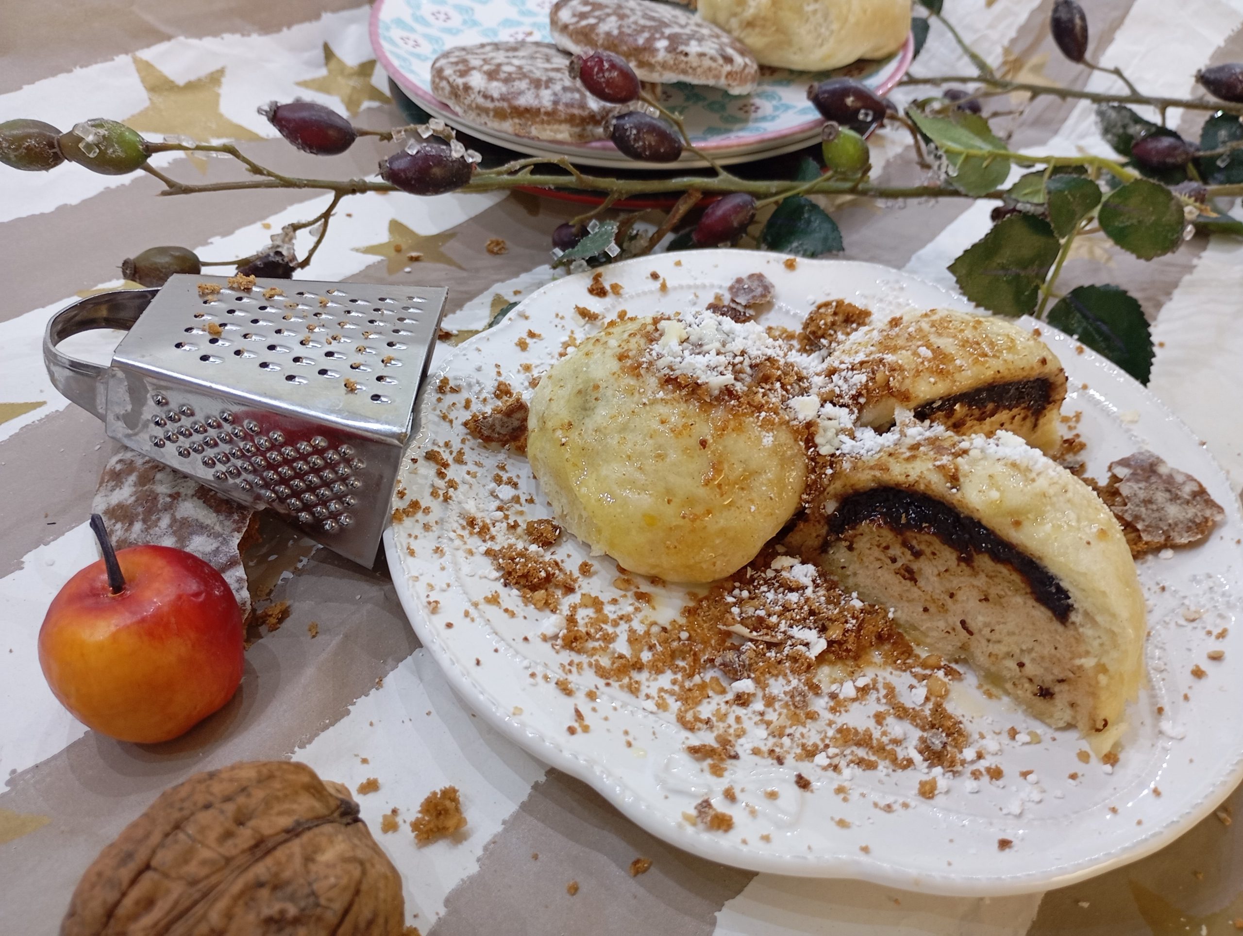 Buchty polejeme roztopeným maslom, posypeme práškovým cukrom. Ako posyp som nastrúhala rumové perníky….nebudú nastrúhané pekne, lebo sa viac drobia, ako strúhajú, ale ničomu to nevadí.