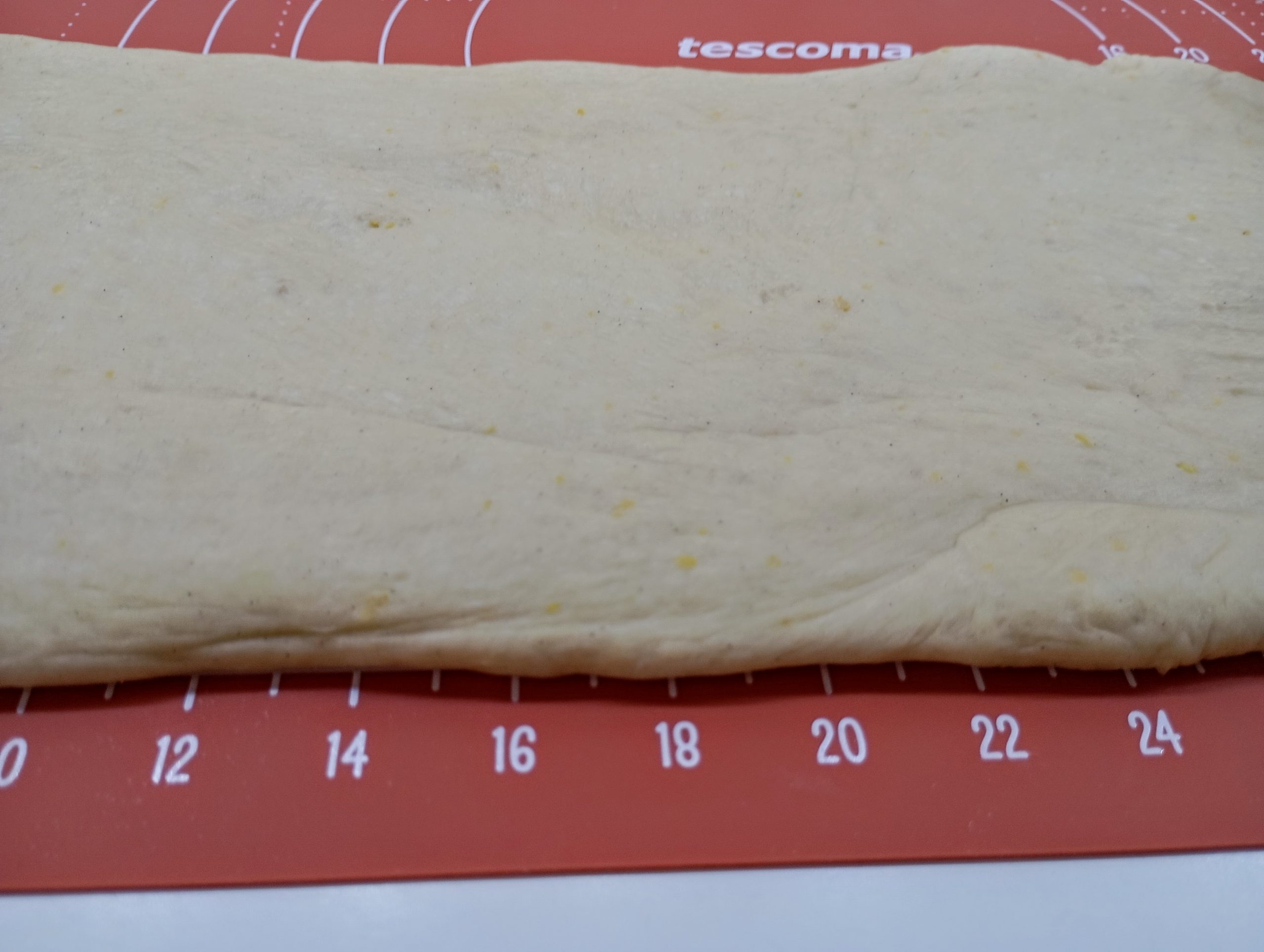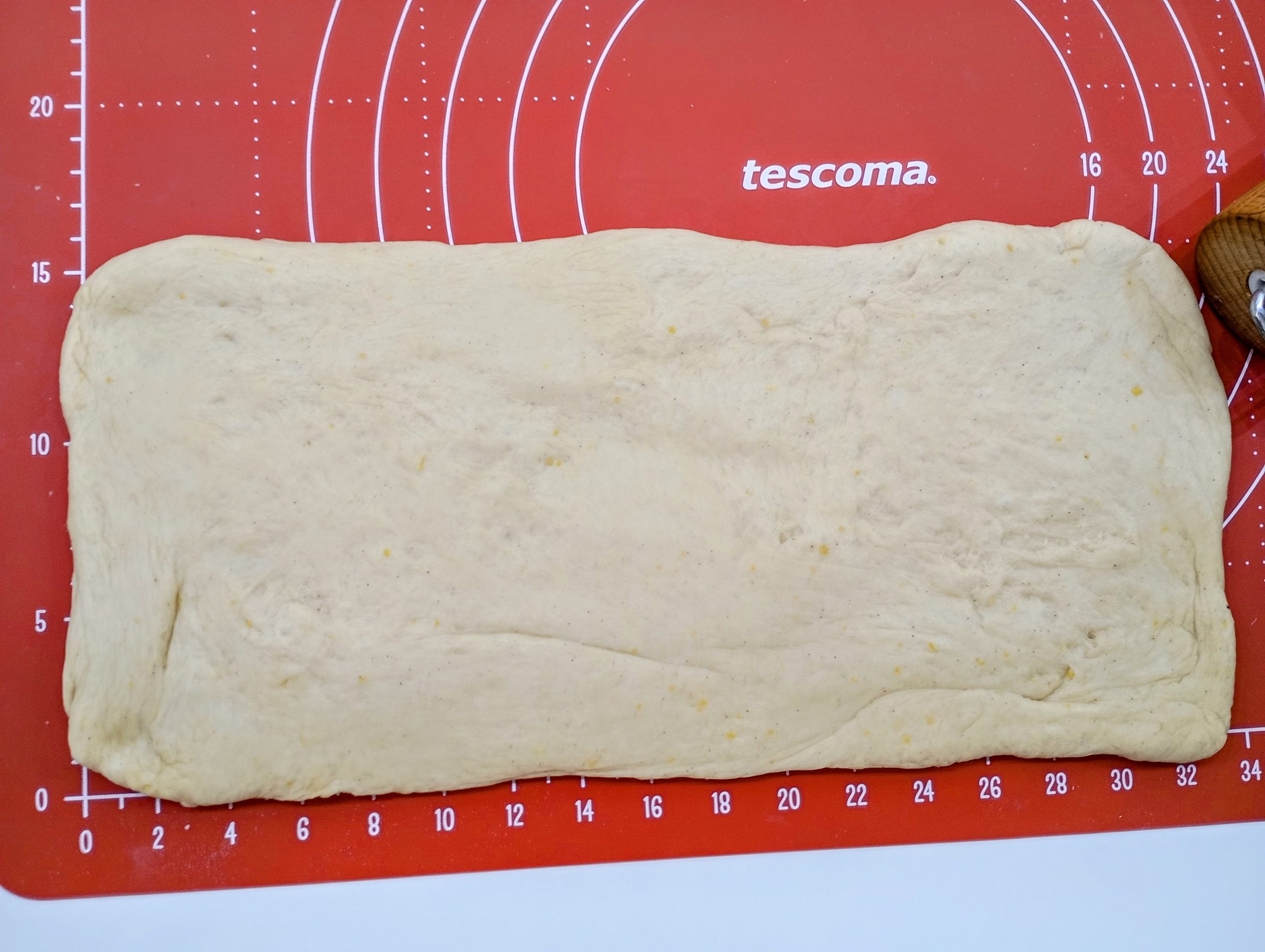 Nakysnuté cesto vyvaľkajte na plát približne 35 x 30 centimetrov s hrúbkou asi jeden a pol centimetra.
