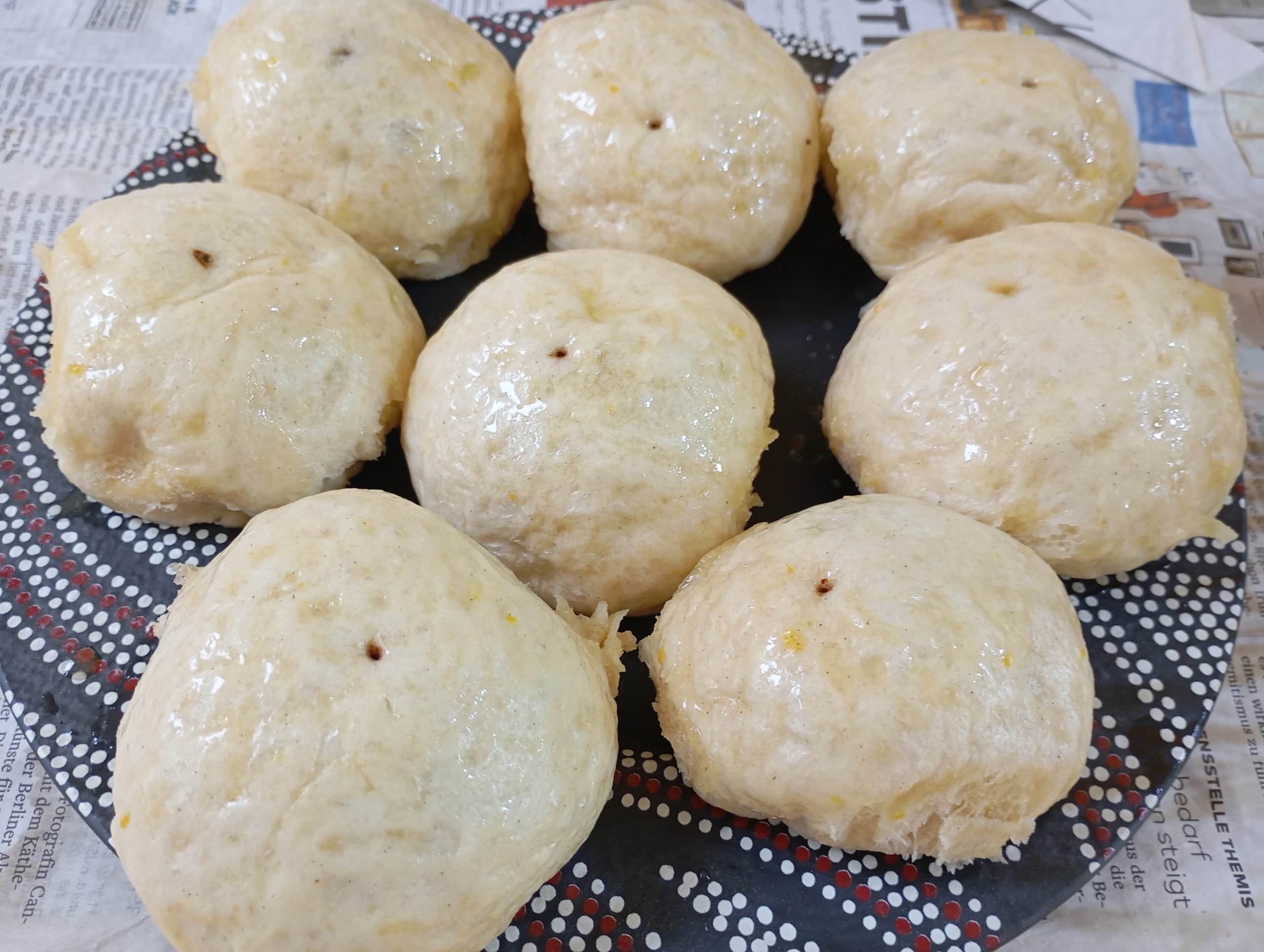 Sú hustejšie, ale sú ľahučké, mäkké, pružné. Nevšednejšiu chuť im pridáva strúhaná citrónová kôra . Potrela som ich maslom, ochutené rumom a ten úplne najvýraznejší tón im dodala posýpka, ktorú som urobila zo strúhaných rumových perníkov.