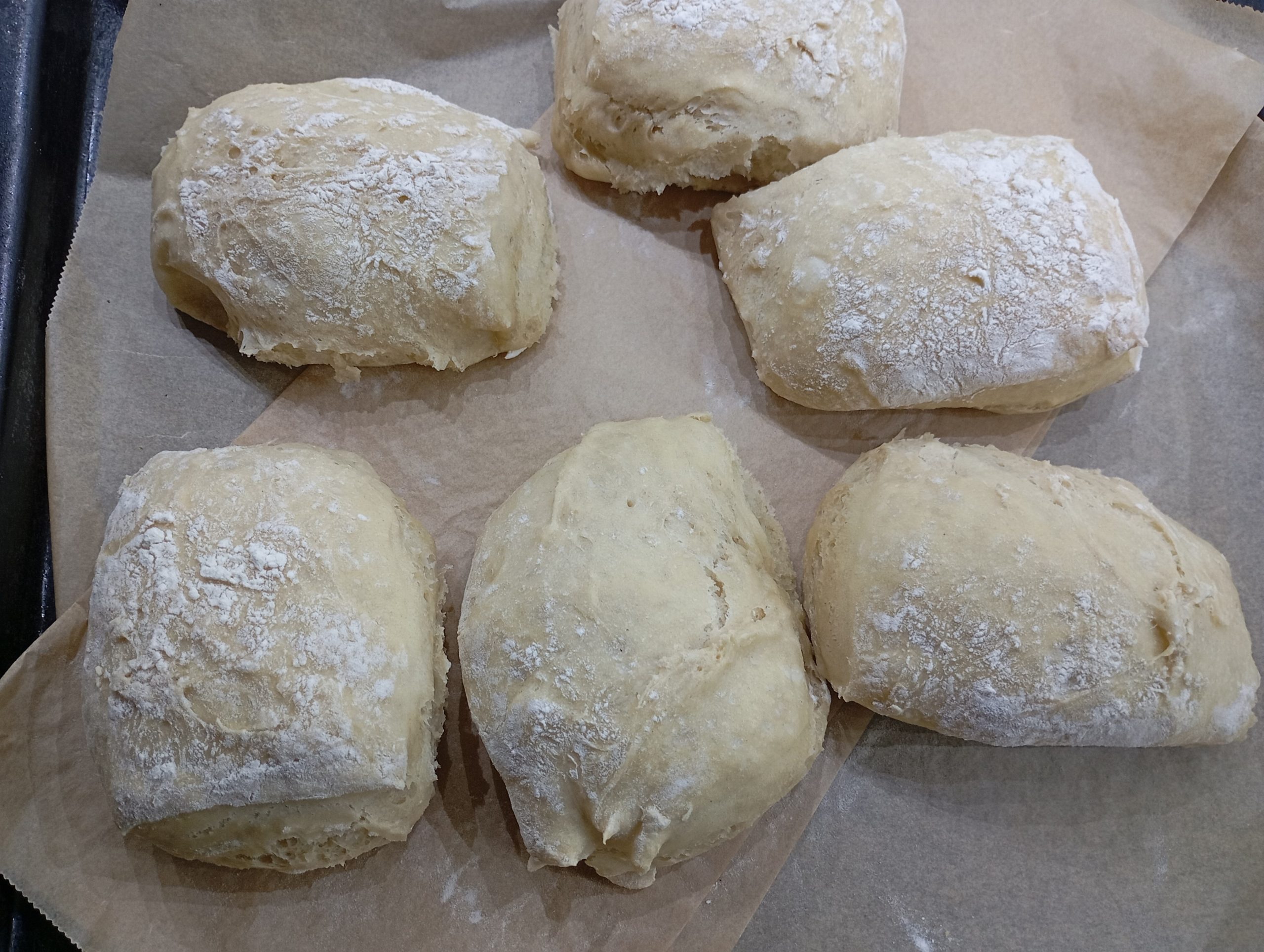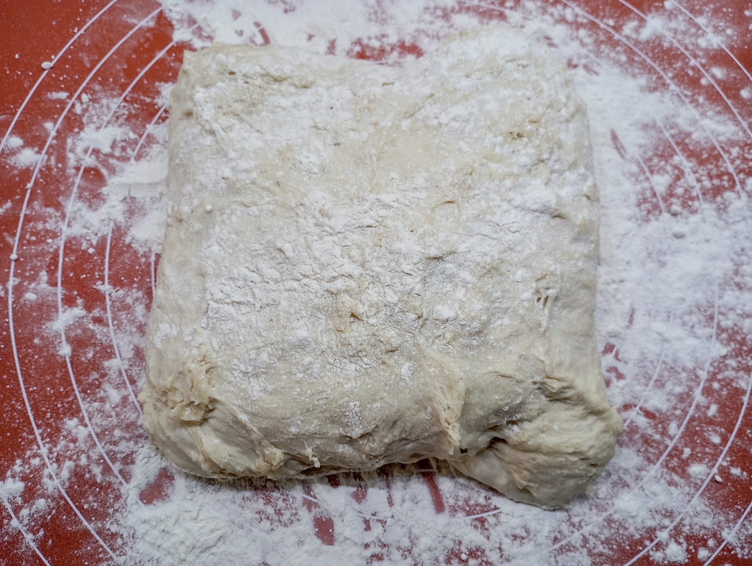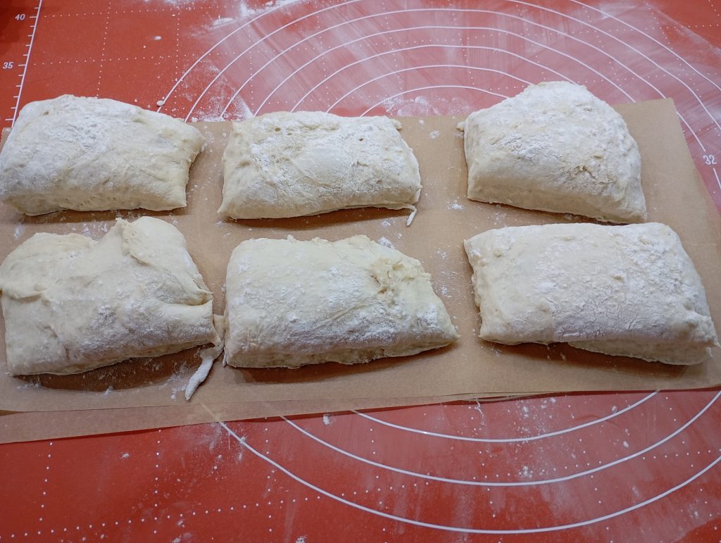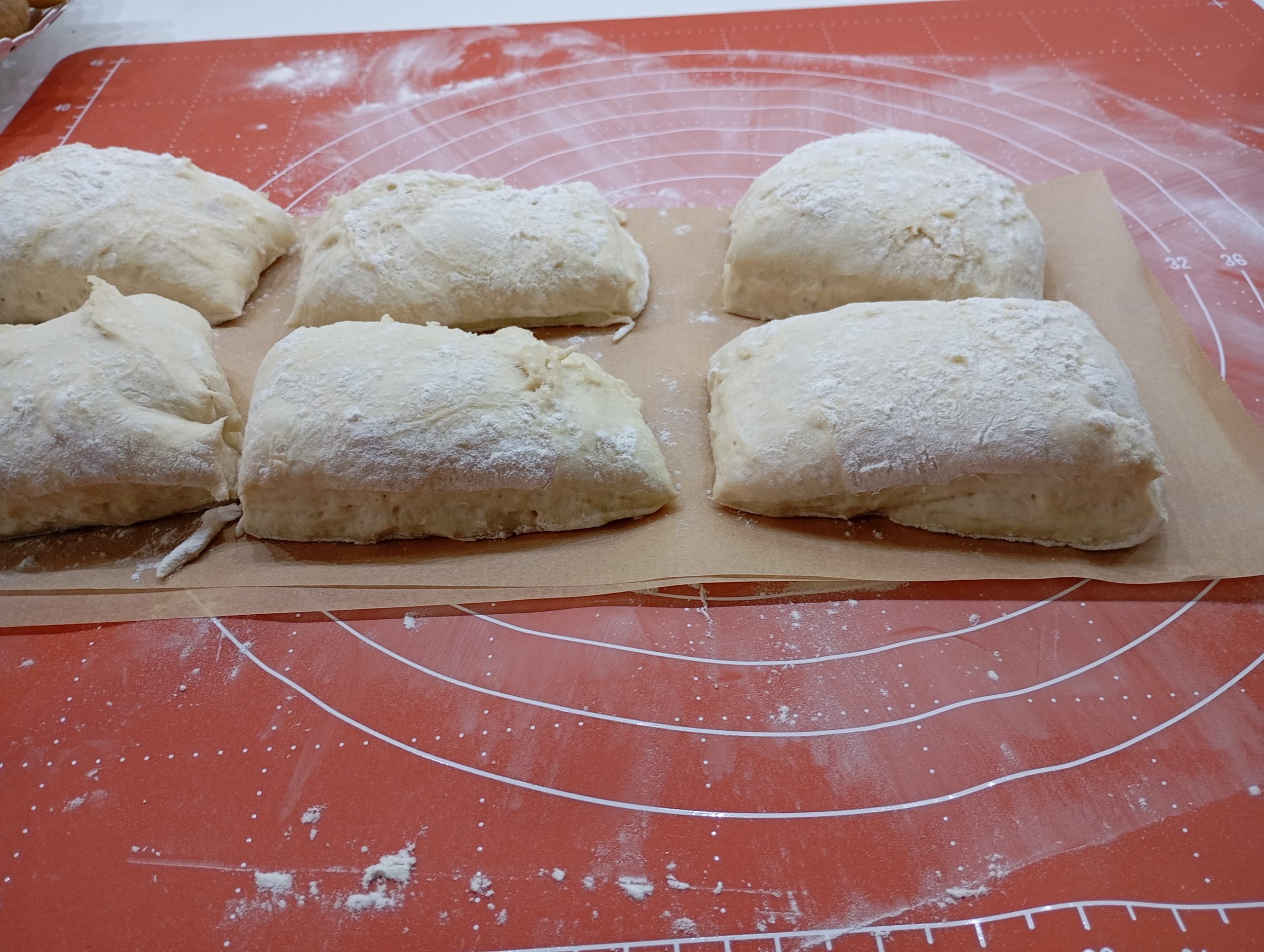 Pracovnú dosku jemne posypeme múkou. Cesto preklopíme tak, aby sa povrch narušil čo najmenej. Ostrým nožom alebo škrabkou rozdelíme cesto na približne osem kusov. Jednotlivé kusy iba jemne nadvihneme a prenesieme na papier na pečenie. Necháme ich desať minút odpočívať, aby sa napätie po rezaní uvoľnilo.