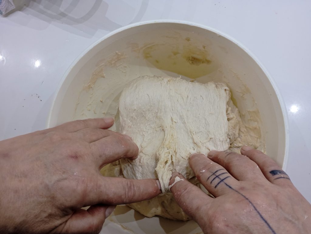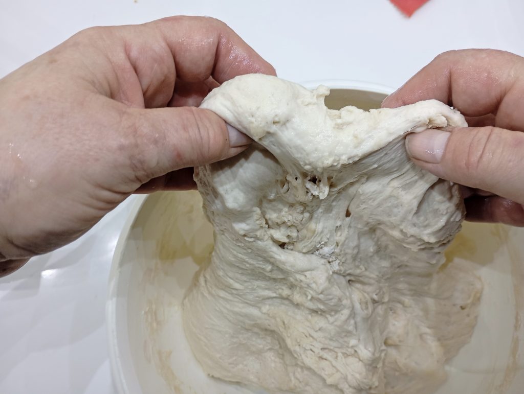 Po dvadsiatich minútach si navlhčíme ruky vodou. Cesto z jednej strany nadvihneme, natiahneme smerom nahor a preložíme na opačnú stranu. Misku pootočíme a urobíme celkovo štyri takéto preklady. Toto jedno skladanie stačí, aby sme získali pevnejší povrch a pravidelnejšiu striedku.