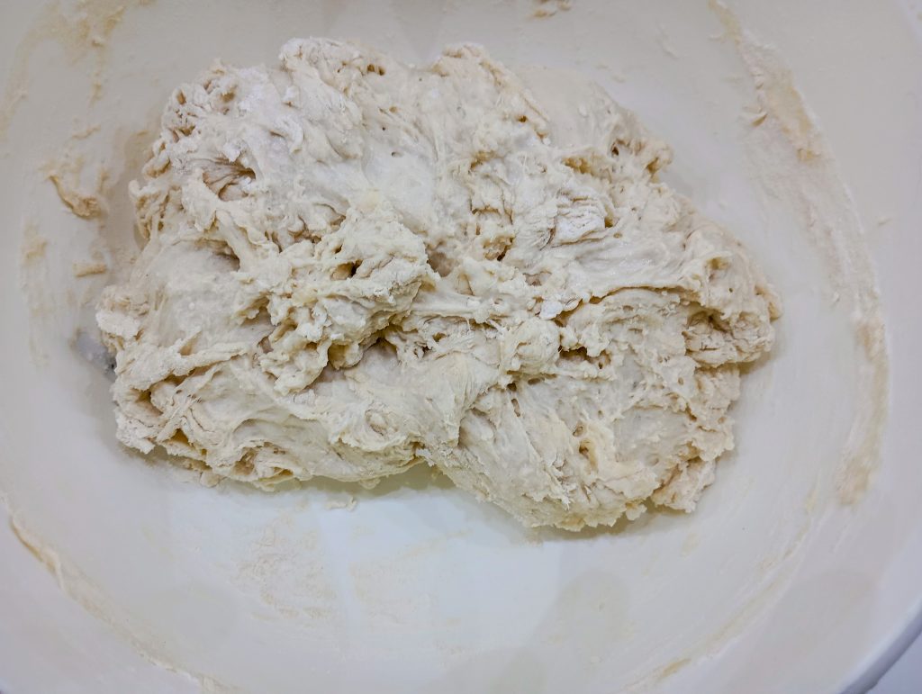 Vareškou miešame dovtedy, kým v mise nezostane žiadna suchá múka. Cesto je v tejto fáze lepivé, hrboľaté a hustejšie. Cesto skutočne nepotrebuje, aby ste do neho strčili, čo len prst a len to všetko pozhŕňajte do jednej kopy vareškou.
