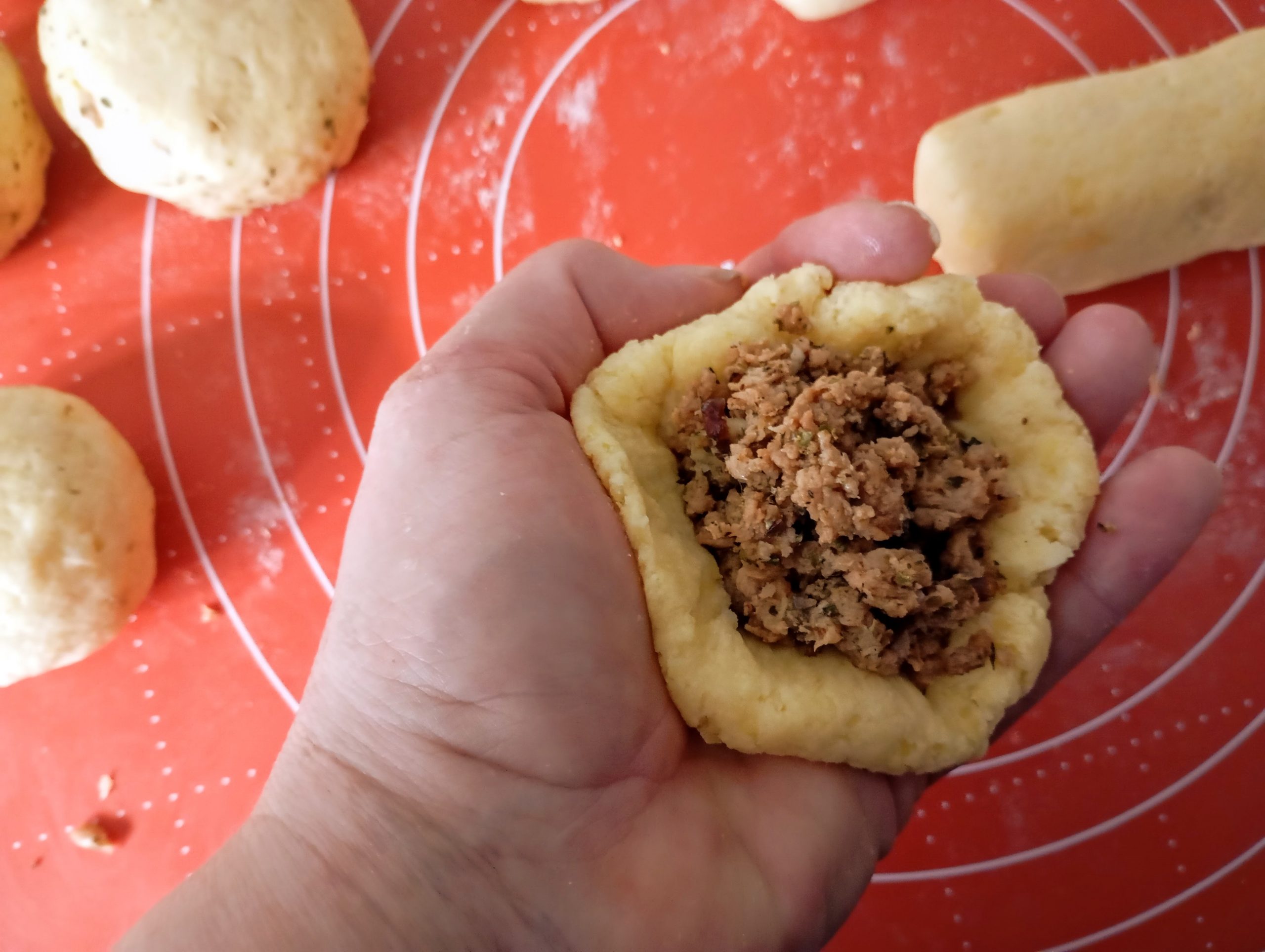 Potom dvoma prstami tú plnku akokeby vtláčam do dlane a tvarujem do mištičky.