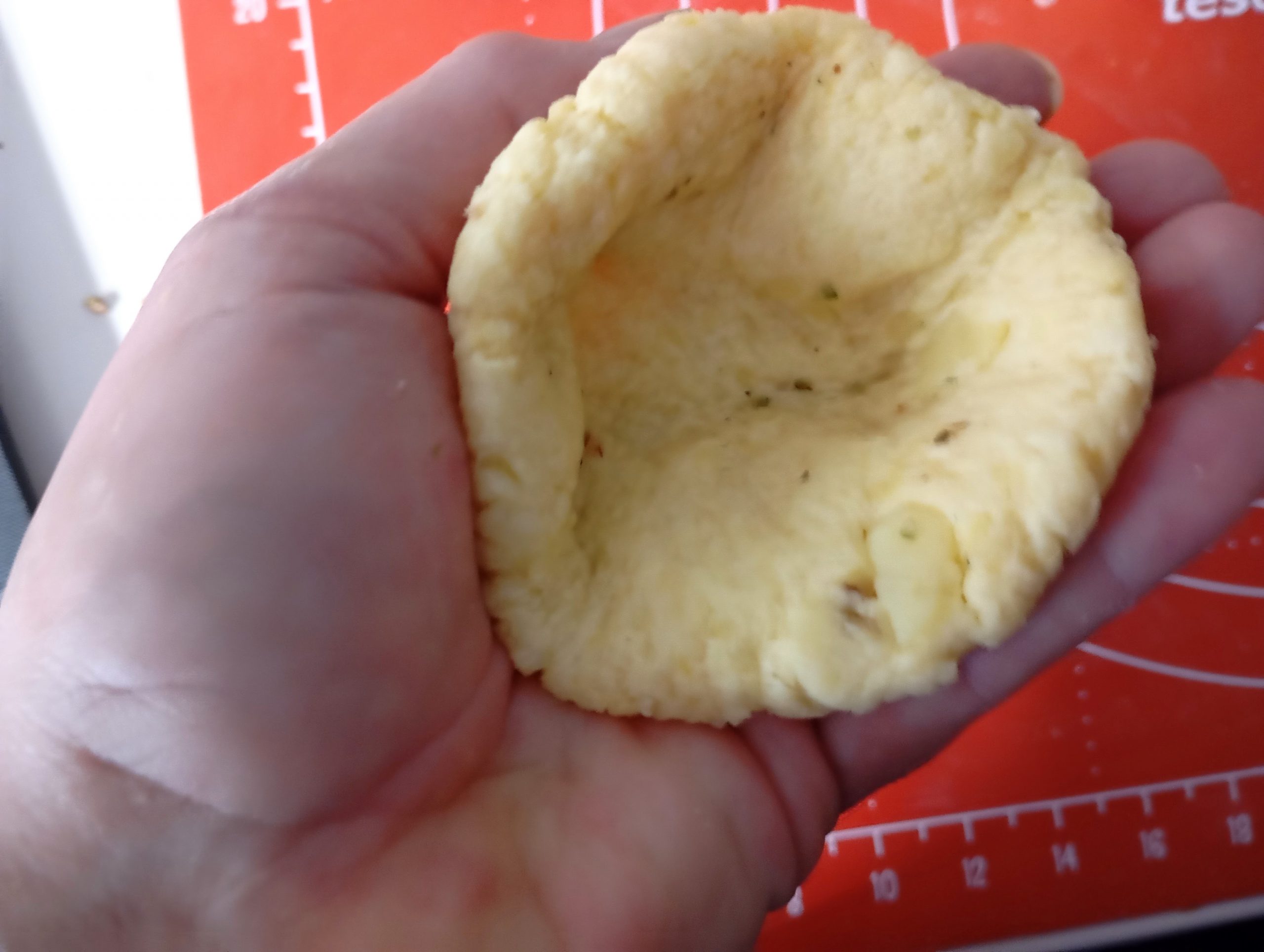 Každú guľku roztľapkáme na veľkosť dlane, v dlani z ťapky vytvoríme ako keby mištičku.