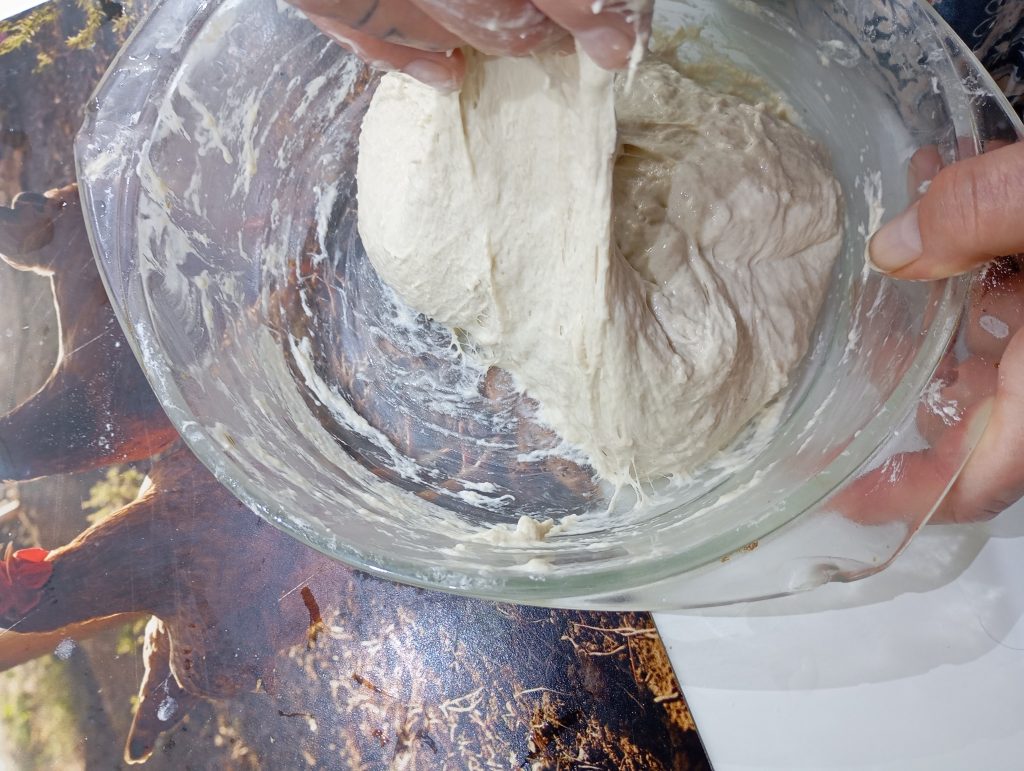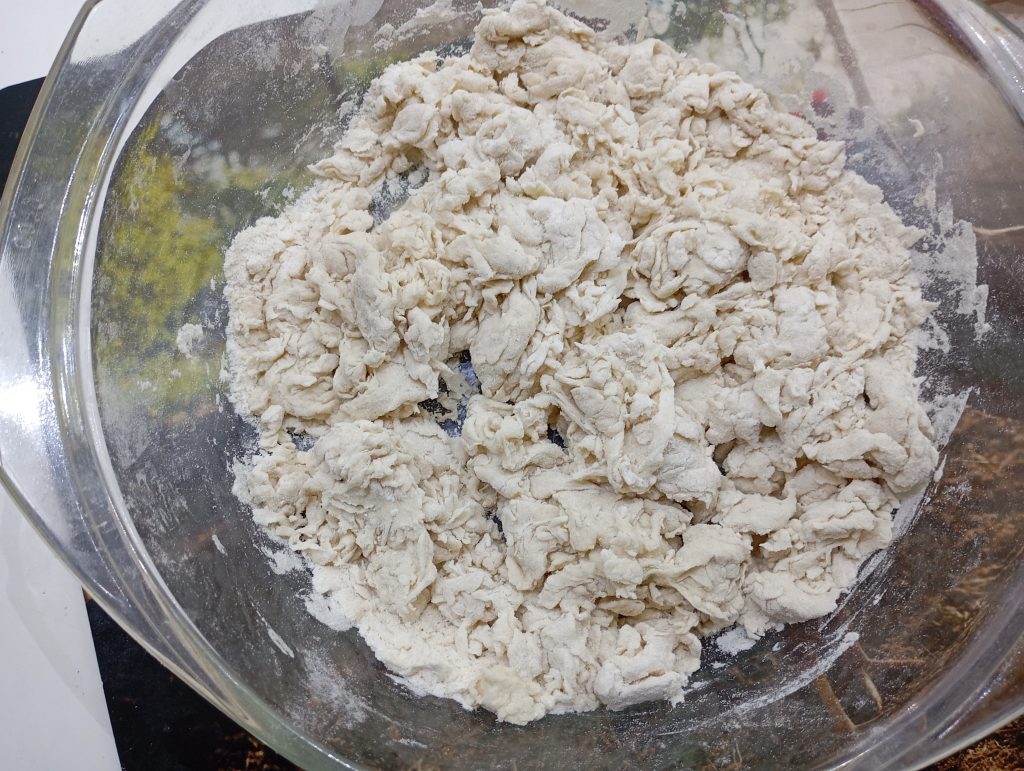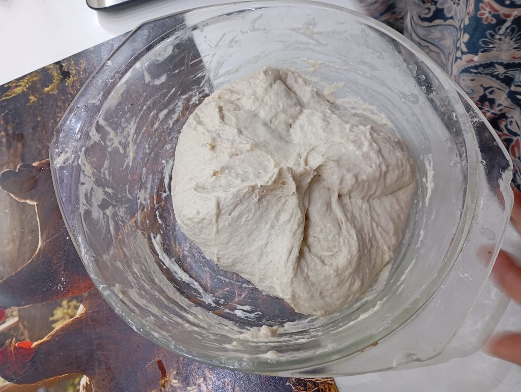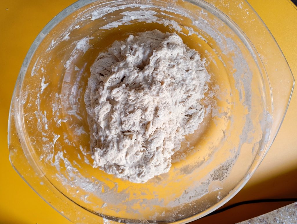 Takto vyzerá správne hydratované a vymiešané cesto ktoré tvorí vodnatá biga + 200 g T65 + 1 gram suchého droždia + soľ + 45 g vody. Cesto necháme prikryté odpočívať 30 minút
