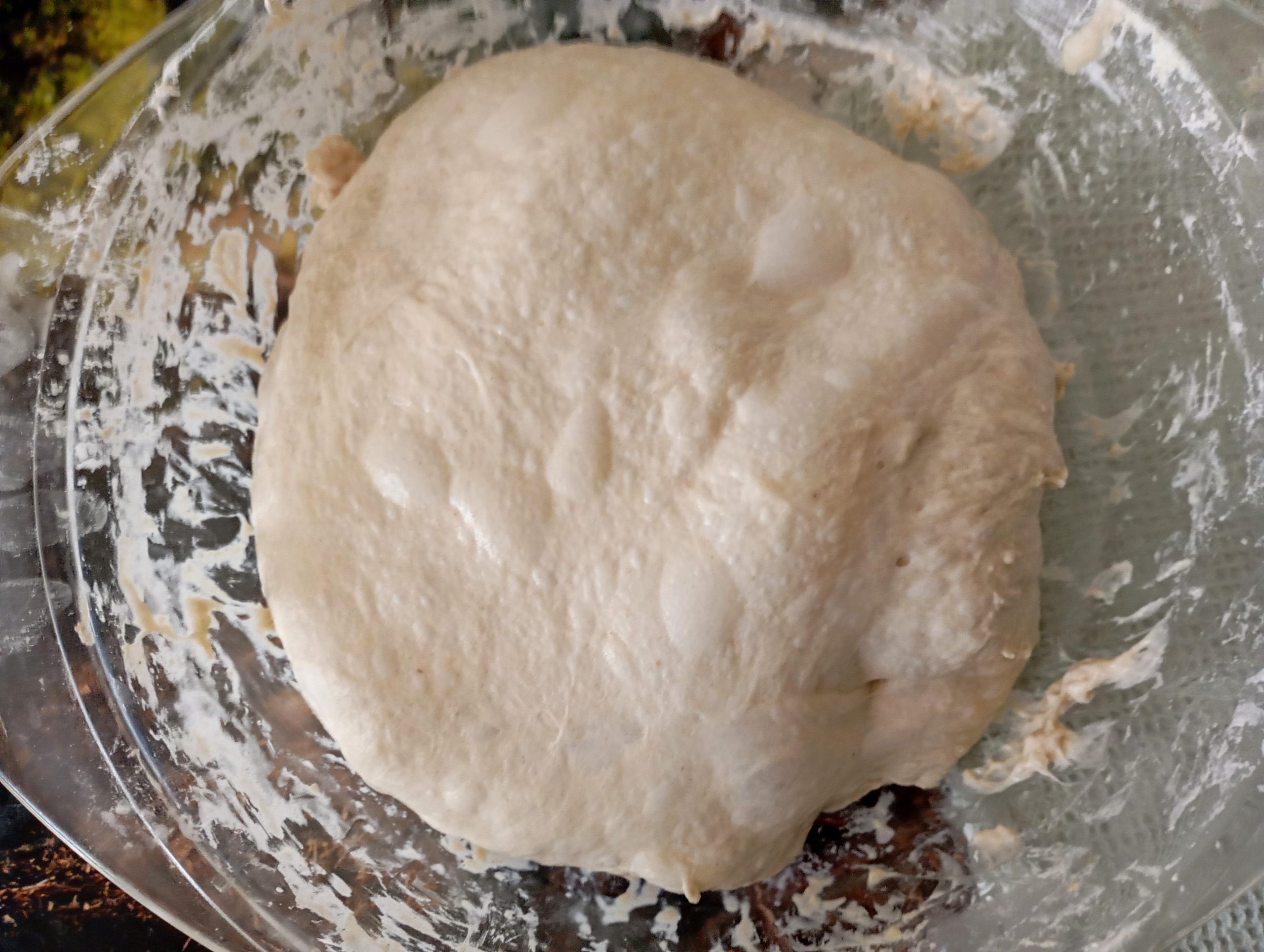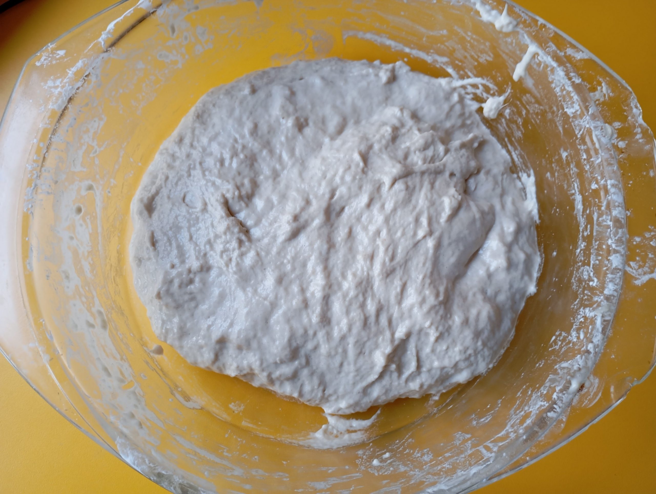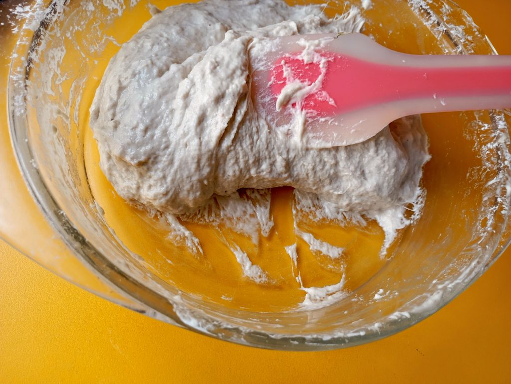 Takto vyzerá správne hydratované a vymiešané cesto ktoré tvorí vodnatá biga + 200 g T65 + 1 gram suchého droždia + soľ + 45 g vody. Cesto necháme prikryté odpočívať 30 minút