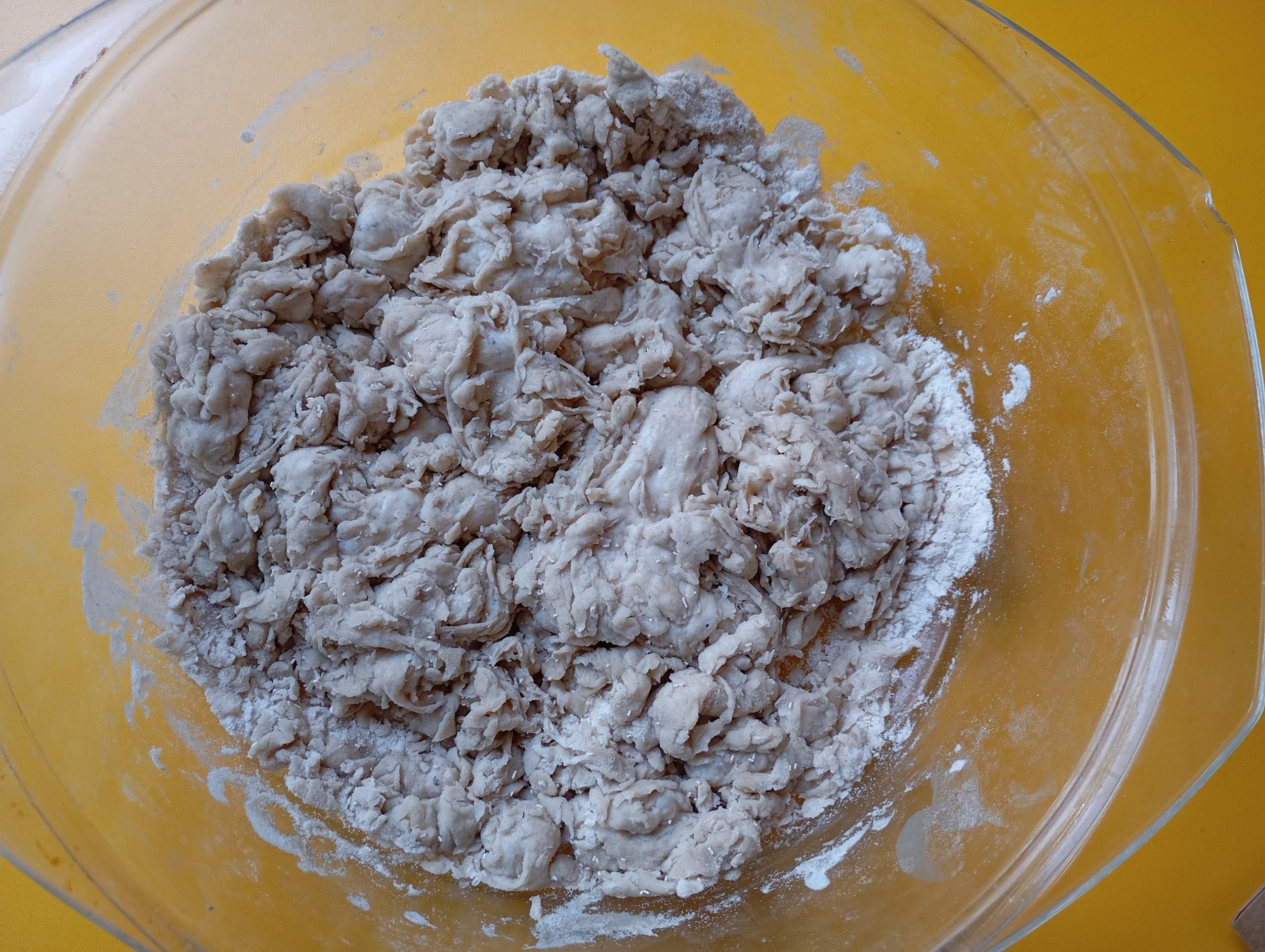 Tu je ešte viditeľné , že sa dá normálne podobrať a stále drží tvar, tak ako ho zdvihnem, tak ostane. Je po druhej dávke vody. Toto cesto je ešte stále husté