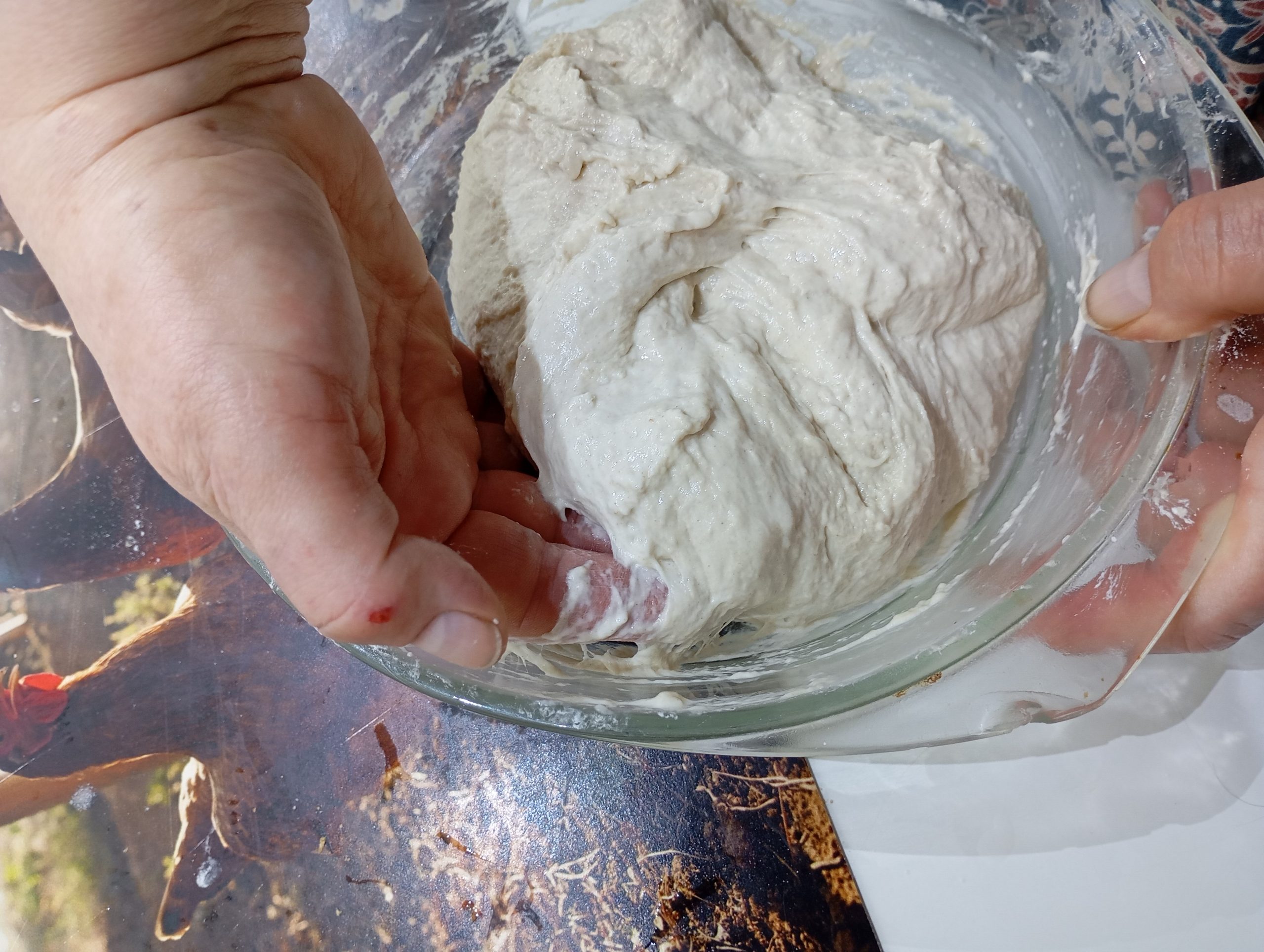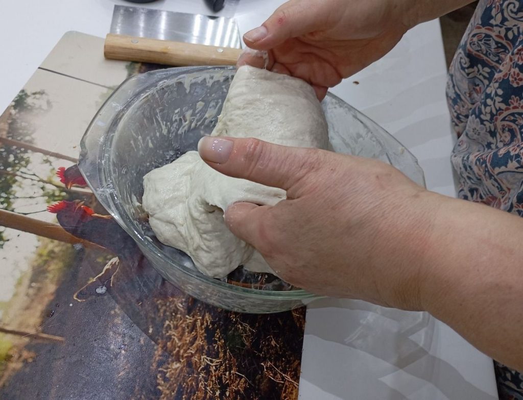 urobíme druhé preloženie. Cesto je už istejšie, ale stále veľmi živé. Tu som už cesto vyťahovala dohora. Robíme to opatrne a pomaly. Lepok už pracuje na plné obrátky a drží cesto krásne pokope. S cestom pracujeme veľmi opatrne.
