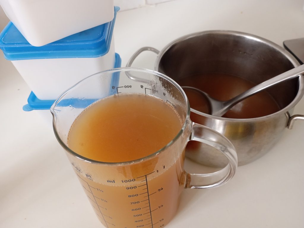 Na povrchu vývaru sa mi vyzrážal tuk a loj. Ten som bez milosti odstránila a vyhodila. Nakoniec som ho ešte krátko prevarila, rozdelila na menšie porcie a dala zamraziť, aby som ho mala vždy po ruke na podlievanie.