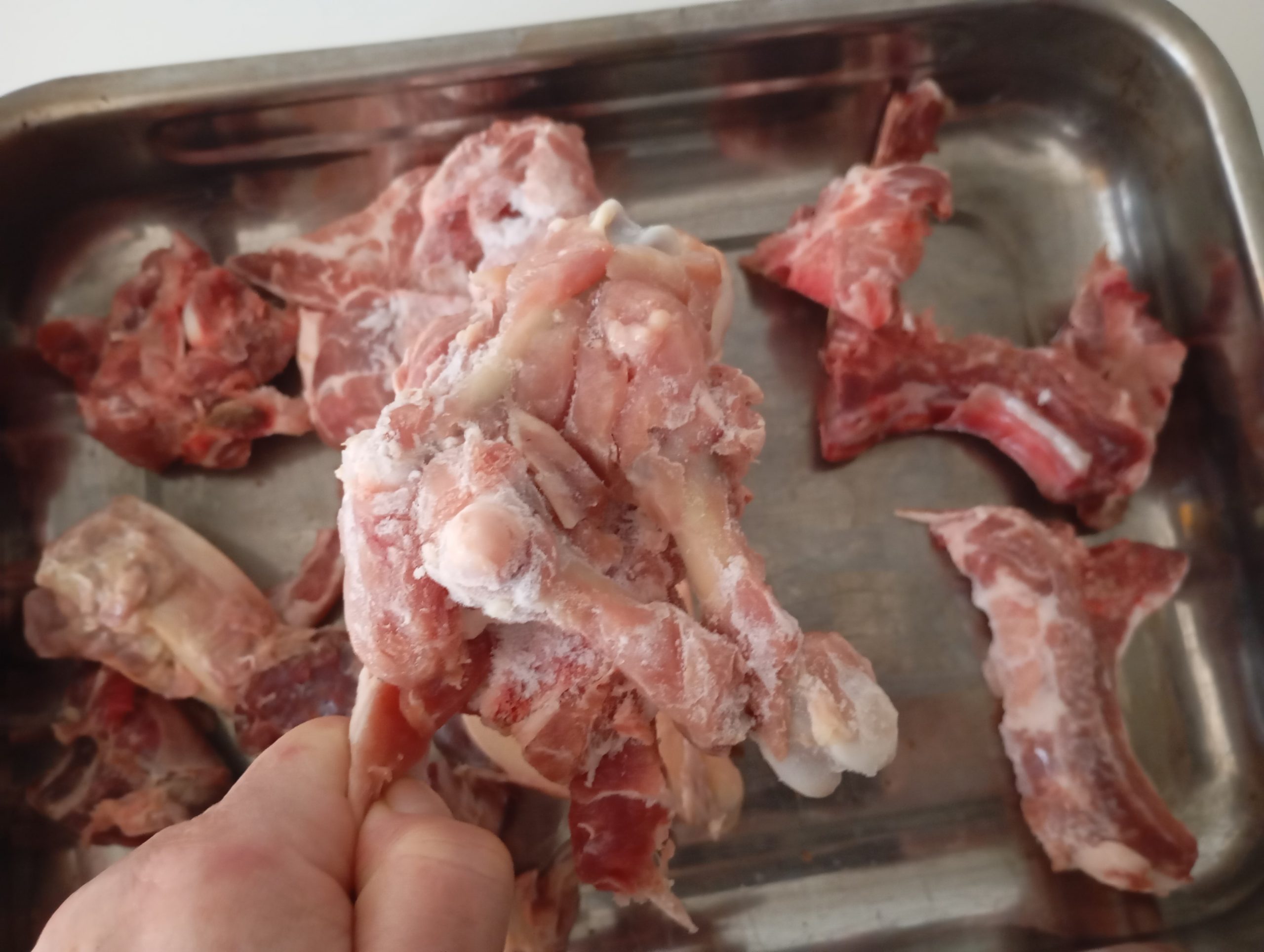 Kosti necháme mierne povoliť, nerozmrazujeme úplne, ako vidíte ostala mi dokonca taká malá hŕbočka tenkých kostí takto pokope a už som to neriešila.