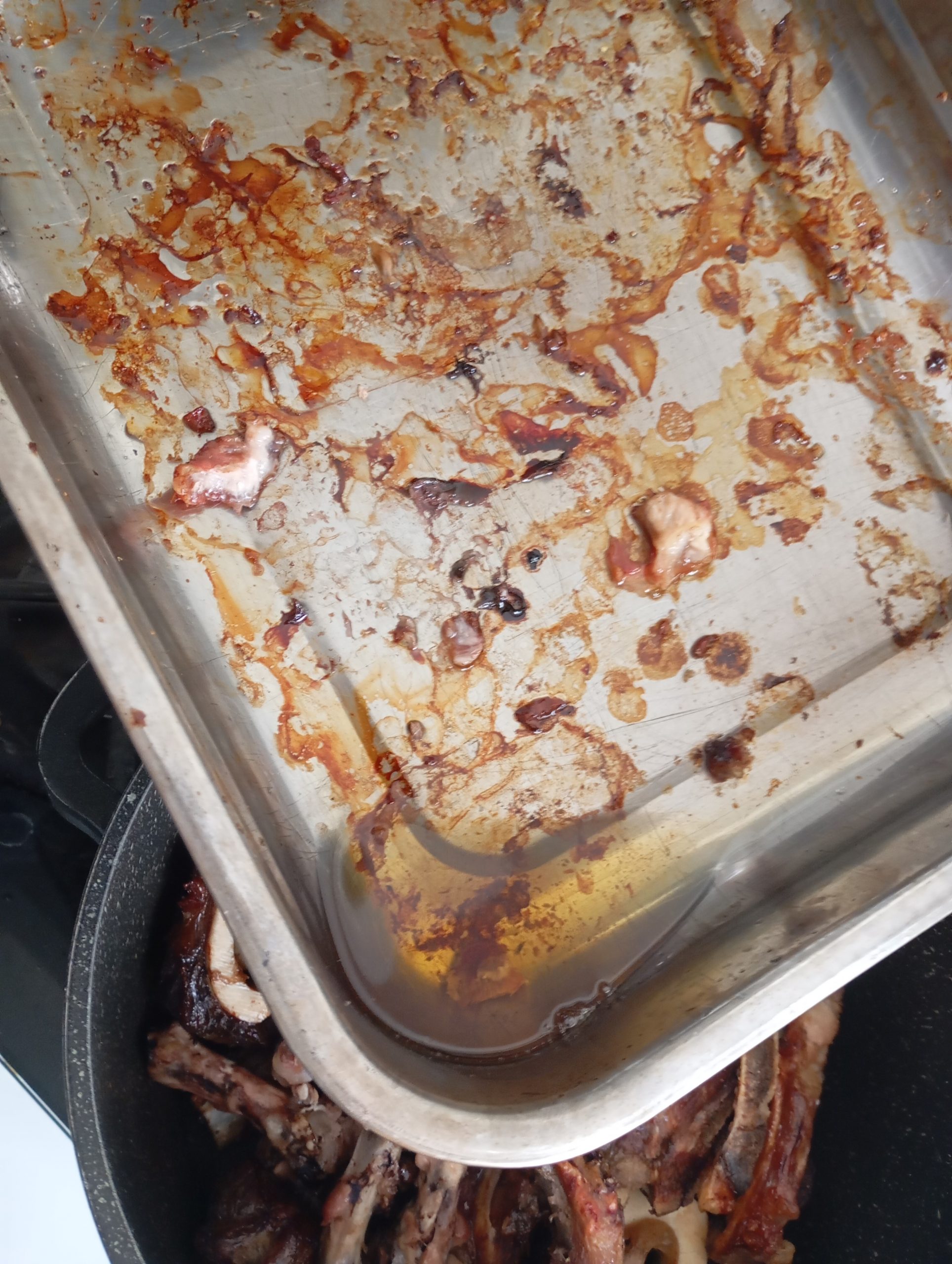 Do horúceho pekáča nalejeme trochu vriacej vody a lyžicou zoškriabeme všetko pripečené zo dna . Túto tekutinu pridáme do hrnca ku kostiam, pretože práve v nej je najviac chuti.